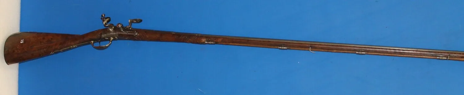 Le iniziali CLP sono la firma del maestro di canne Cristoforo Leoni di Pistoia, operante alla corte medicea negli anni Sessanta e Settanta del Seicento. Questo esemplare potrebbe essere la «spingarda» di Cristoforo Leoni presente nell’inventario dell’Armeria medicea del 1715 (Archivio di Stato di Firenze, Guardaroba Mediceo n. 1231 bis, c. 207r.). Questo genere di archibuso, con canna molto lunga, era particolarmente adatto alla caccia ai volatili di palude, che in genere veniva svolta sulle piccole imbarcazioni a remi prive di chiglia. Quindi la leggerezza e la maneggevolezza dovevano compensare la lunghezza della canna. Anche la mira doveva essere agevolata, modellando sul calcio un comodo poggiaguancia e, vicino alla bocca della canna, una tacca di mira di colore differente dal metallo della canna, in questo caso in color oro. Trascrizione dall’Inventario del 1878: «Spingarda canna liscia, mira doppia di ottone. Batteria liscia con acciarino alla fiorentina. Mezza cassa di noce montata in ottone. Lung. della canna m 1,68, lung. totale m 2,08». La scheda menziona anche il numero 235 di un inventario precedente a quello del 1878, di cui non si ha riscontro.
