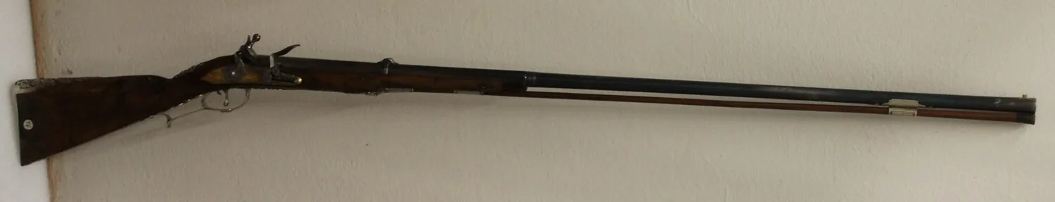Arma di costruzione speciale, secondo Boccia e Thomas dono dell’imperatore Leopoldo I al Granduca Ferdinando II o al fratello don Mattias, grande appassionato di caccia, sulla base del privilegio, scritto sulla canna, di Leopoldo I al suo armaiolo di corte J. Jousse Goliar, di cui si conosce solo un altro archibuso simile a questo proveniente dal gabinetto di caccia dei principi di Liechtenstein. Trascrizione dall’Inventario 1878: «Archibuso canna brunita violetta e sfaccettata all’esterno, rigata all’interno, detta canna si svita ad un terzo della culatta. Batteria cesellata con acciarino simile. Cassa col solo calcio di noce con intagliature di acciaio ed ottone, e l’iscrizione nella coda del vitone CUM PRIVILEGIO SAC. CAE. MAYESTATIS. Lung. della canna m 0,72, lung. totale m 1,01». La scheda menziona anche il numero 201 di un inventario precedente a quello del 1878, di cui non si ha riscontro.
