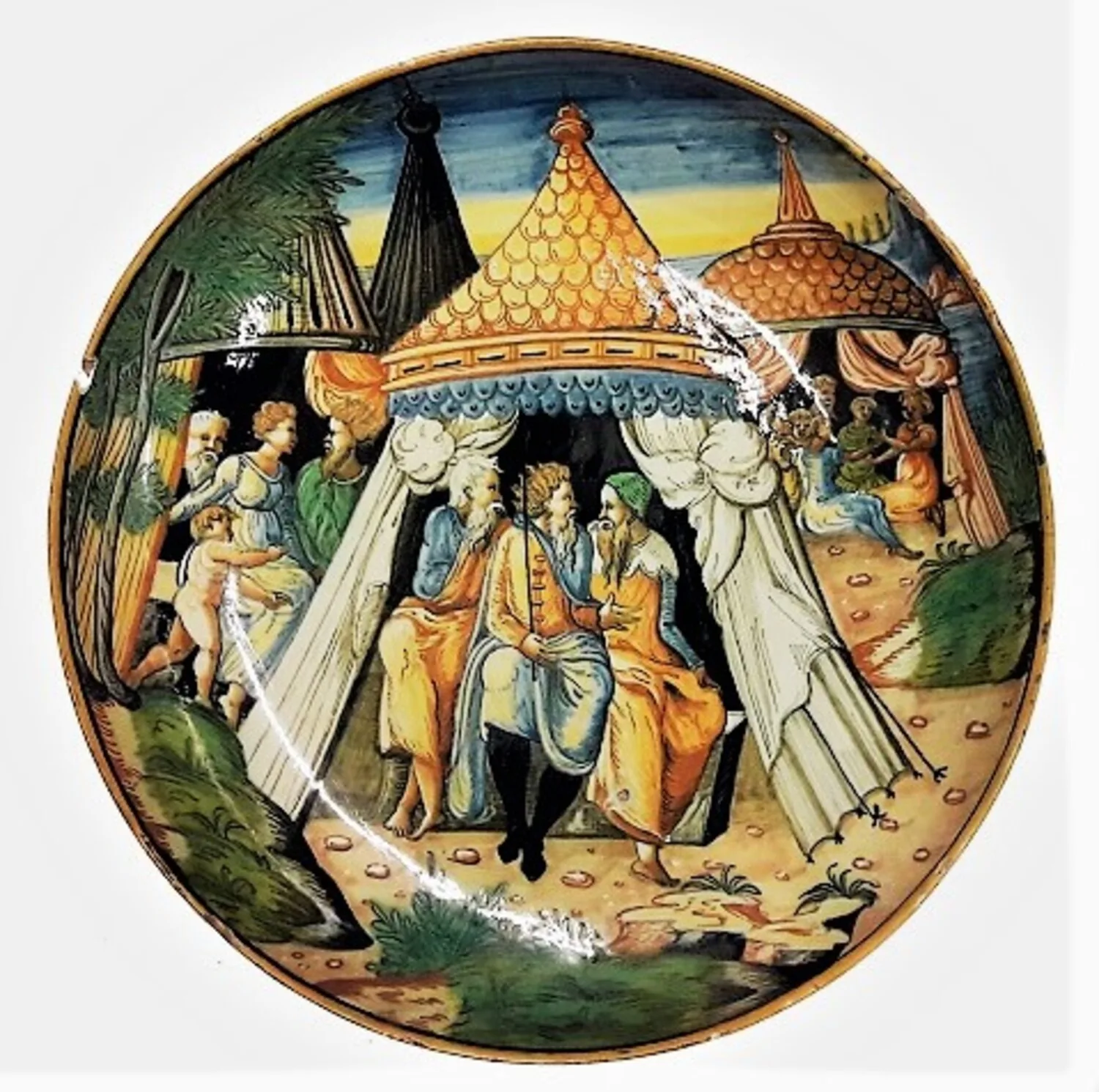 Un esemplare, in tutto simile, è conservato al Museo Internazionale delle Ceramiche di Faenza (Scavizzi 1966, fig.7) e ricalca lo stile specialmente nelle fasce attorno al medaglione centrale mentre, l’amorino del pannello principale, trova il confronto più pertinente con quello disegnato, forse dalla stessa mano, sulla crespina conservata al Victorian and Albert Museum di Londra (Rackham 1940, n.1028).