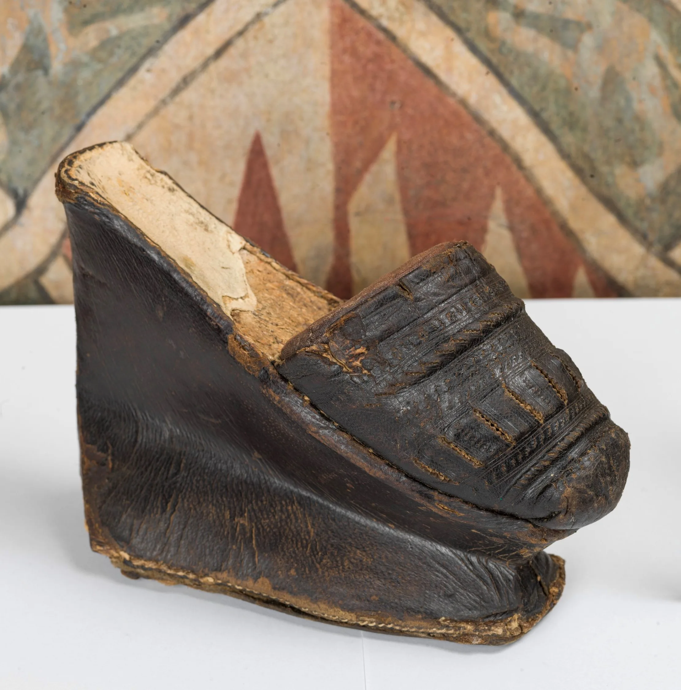 La punta arrotondata e la lavorazione della tomaia — realizzata a fasce a impressione e a tagli — inducono a collocare il manufatto tra la fine del Cinquecento e l’inizio del Seicento, con una probabile origine toscana.